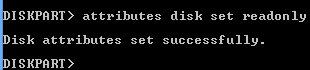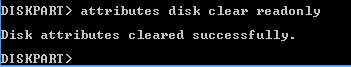 3.Then type attributes disk clear readonly then hit enter a “Disk attribute cleared successfully” will be displayed.