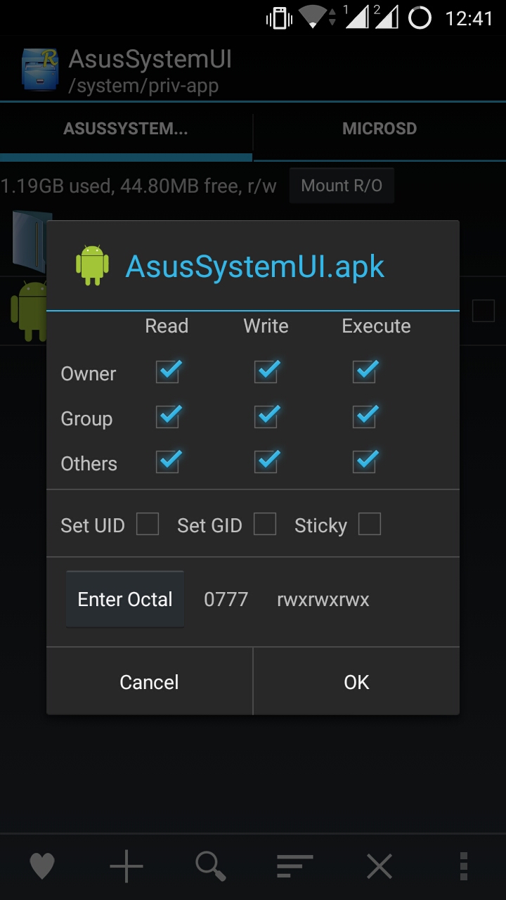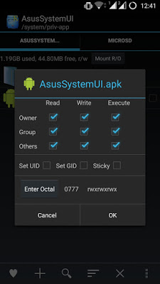 Step 5 – After copying the “AsusSystemUI.apk” in the folder “system“, modify its permissions. you can do that one by holding your finger on the file, a pop-up will appear with many options, click on permissions and modify the file leaving like the image below.