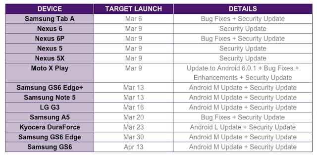 Along with Moto X play Some other devices are going to get different software and security update this march.Likewise, Samsung Galaxy S6 edge and S6 owner will going to get first hands on android marshmallow on 30 march and 13 April 2016 respectively