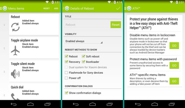 With this xposed module, you can add, remove and reorder item in power menu of your device. This mode is supported by all TouchWiz, AOSP, CM13 and Xperia ROMs.The module has an Anti Theft option which protects your phone from thieves. It disables menu items from the lock screen and protects the menu items with passwords.