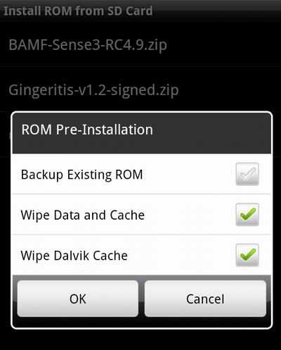 - Tick the ‘Wipe Data and Cache’ and ‘Wipe Dalvik’ boxes, and then click OK. The phone will now reboot and start installing your custom ROM. This might take a little while, sometimes up to 15 minutes, so be patient and don’t panic if the device appears to have frozen.