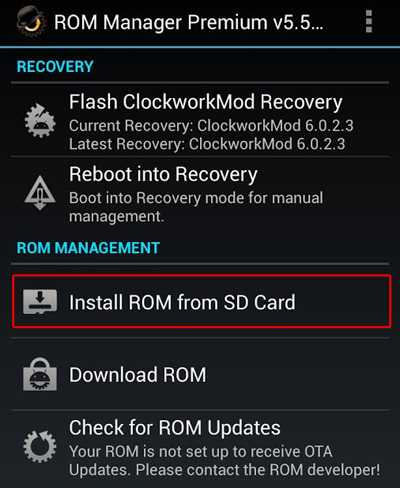 - Once done, reopen ROM Manager and tap on ‘Install ROM from SD card.’