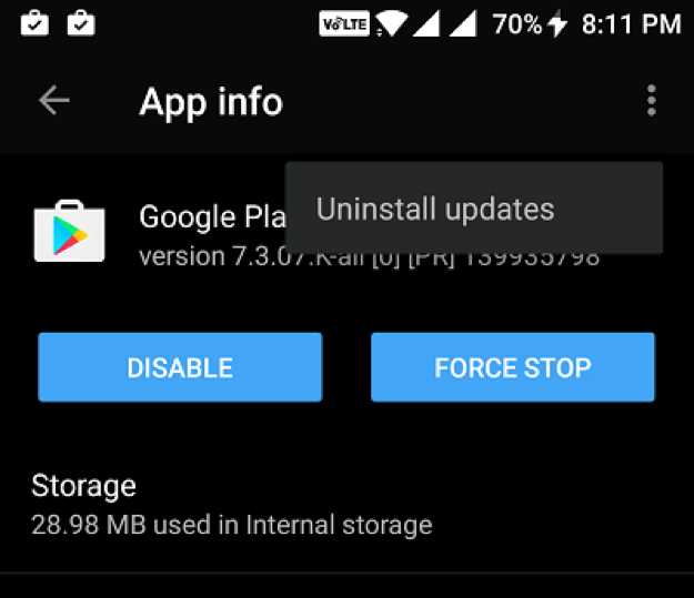 - Uninstall updates for Google Play Services – Settings > Apps > options > show system > Google Play Services > options > Uninstall updates.