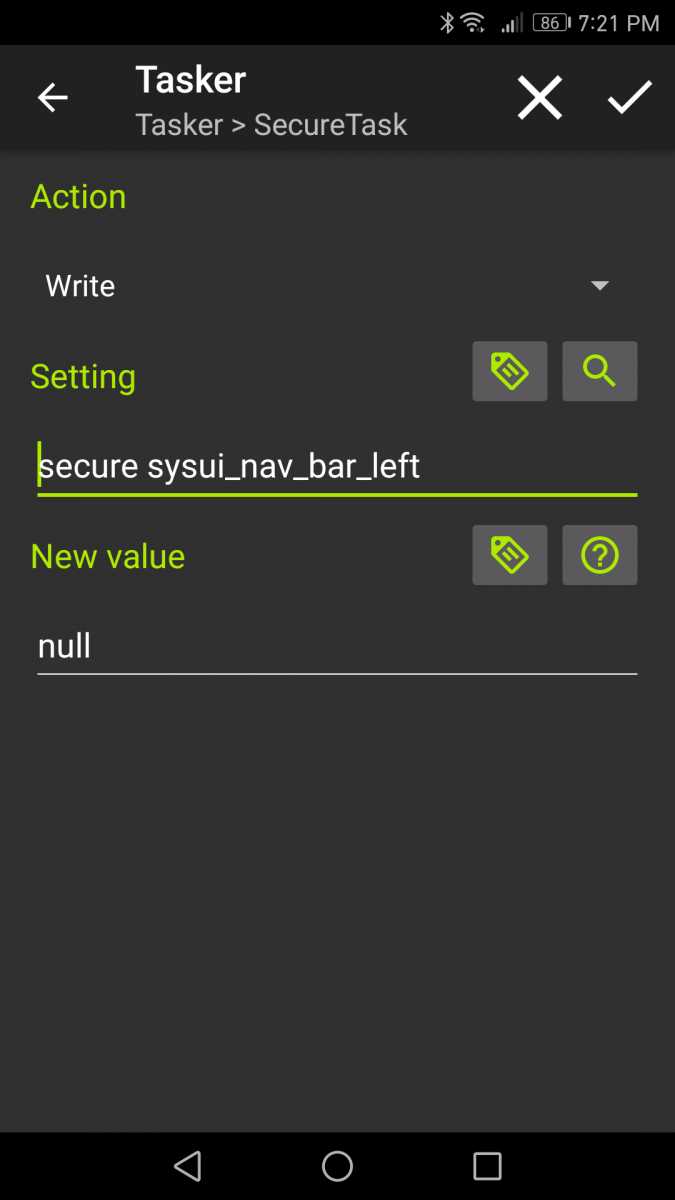 - Plugin –> SecureTask –> Secure Settings. Action: Write. Setting: secure sysui_nav_bar_left. Value: null