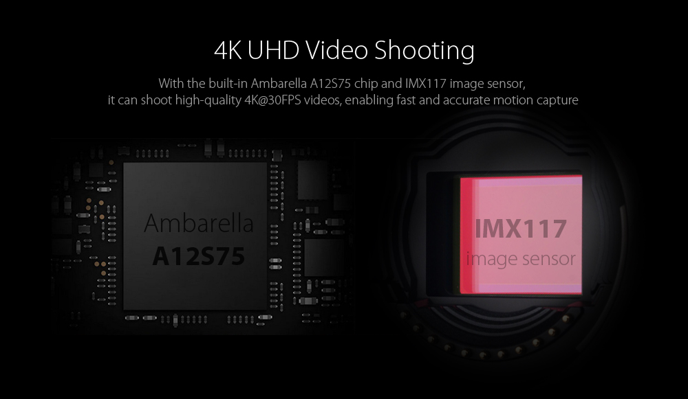 2.Equipped with Ambarella A12S75 chip, presents high quality videos ( 4K / 30fps, 1080P /120fps, 1080P / 60fps Super-view, 720P / 120fps )